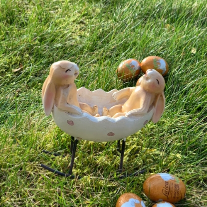 Kaniner i fibermassa och metall. (Chokladen ingår inte i priset) Längd: 10cm Höjd:10cm